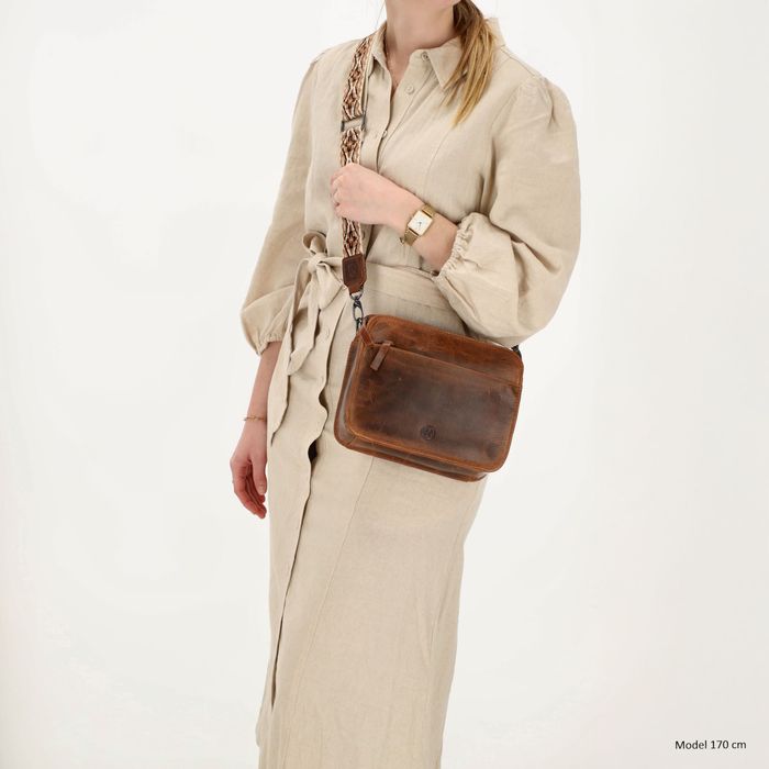 - Twee schouderbanden: een brede band met print en een leren band